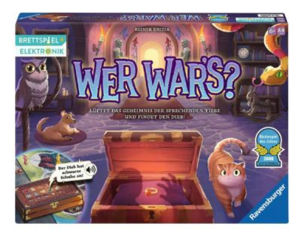 In diesem Brettspiel von Ravensburger müssen 2-4 Spielende den Dieb des Zauberrings finden, um das Königreich zu retten. Dafür müssen sie gemeinsam mit den Tieren im Schloss sprechen und ihnen ihr gewünschtes Futter bringen, denn die Tiere liefern Hinweise, wer den Ring gestohlen hat. Nur einer der Personen im Schloss war's! Nur wer genau? Die Elektronik der Schatztruhe steuert den Spielablauf von „Wer war’s?“ und sorgt dafür, dass jedes Spiel anders verläuft und damit immer wieder aufs Neue spannend ist. Findet den Dieb des Zauberrings! Dieser Spieleklassiker kommt in dieser Version mit überarbeiteter Grafik und ein modernem Design.