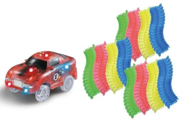 Magic Traxx Starter Set in einer praktischen und verschließbaren Transportbox! Bau Dir Deine eigene Rennstrecke wie Du sie haben willst! Mit dem Starter Set von Magic Traxx ist das kein Problem! Die Schienen sind flexibel und lassen sich auch während des Betriebes beliebig verschieben und verformen. Forme Brücken und Kurven immer wieder neu. Die hell beleuchteten Autos und die reflektierenden Schienen sorgen dabei auch im Dunkeln für mehr als ausreichende Sicht um Deiner Phantasie freien Lauf zu lassen. In diesem Starter Set mit insgesamt 223 Teilen ist alles enthalten, was Du für den Start benötigst. Mit zusätzlichen Packs lässt sich das Starter Set nach Deinen Wünschen erweitern- alles kein Problem! Alle Magic Traxx Artikel sind miteinander kombinierbar. Mit dem beiliegenden Aufkleber Set kannst Du Deinem Rennwagen sein eigenes Aussehen verpassen und ihn so unverwechselbar ''''''''designen'''''''' Technische Daten: - neonfarbende Schienenteile - leuchten im Dunkeln - Rennwagen mit LED Beleuchtung - Aufkleberset - Fahrzeug elektrisch betrieben - Streckenlänge ca. 3,35m Lieferumfang: - komplettes Schienenset, leuchtend - 1 x Fahrzeug mit Beleuchtung - 1 x Aufkleberset - 1 x Anleitung in Deutsch und Englisch - 1 x Transportbox Kunststoff wird noch benötigt: 2 x AA 1,5V Mignon Batterien Für Kinder ab 3 Jahre unter Aufsicht''''''