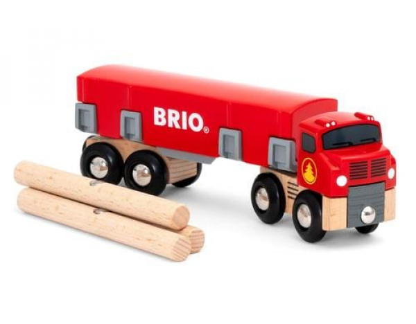 Der Holztransporter ist bereit, einige schwere Lasten durch die BRIO World zu transportieren. Dieser lange rote Sattelschlepper mit abnehmbarem Anhänger verfügt über einen verborgenen Motor, der bei nach vorne gekippter Sattelschlepperkabine zu finden ist, sowie über die serienmäßige BRIO-Magnetkupplung, die eine Verbindung zu anderen BRIO World-Wagen herstellen kann. Hebt man die rote Anhängerabdeckung ab, kommt man an die drei sicher darunter gelagerten Baumstämme. Diese sind mit jeweils einem Metallstift für die Verbindung mit einem Magnetkran der BRIO World ausgestattet. Das reale Eisenbahnspiel hilft Kindern, ihre Umwelt auf spielerische Weise zu verstehen und kennenzulernen, und fördert gleichzeitig die Feinmotorik. Für Kinder ab 3 Jahren empfohlen.