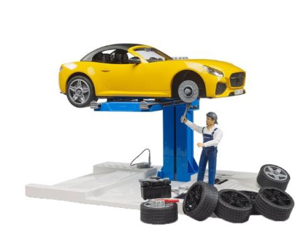 Willkommen in der bworld, der Spielwelt von bruder. Sie enthält bewegliche Figuren, Tiere, Zubehörteile und Themensets. Ob als Fahrer, Reiter, Wassersportler, in der Krankenstation oder in der Motorradwerkstatt: bworld-Artikel bieten schon alleine jede Menge Spielspaß und sind die ideale Erweiterung zu den detailgetreuen Fahrzeugen. Das bworld PKW Service Center ist der Anlaufpunkt für eine Vielzahl von Fahrzeugen, die eine Inspektion benötigen. Auf der komplett höhenverstellbaren Plattform kann die mitgelieferte Mechaniker-Figur die Fahrzeuge inspizieren und auf der Prüfeinrichtung gleich die Bremsen testen. Das Ergebnis wird gleich am Monitor angezeigt. Kleinere Reparaturen können sofort mit dem enthaltenen Werkzeug durchgeführt werden und zum Schluss wird der Reifendruck kontrolliert. In diesem tollen Set enthalten ist der knallgelbe bruder Roadster. Dieser hat sich für einen Reifenwechsel angekündigt. Die Ersatzräder sind ebenfalls enthalten und mit dem Radwechselsystem des Roadsters ist diese Arbeit auch im Nu erledigt. Dieses Modell wird aus stabilem Kunststoff gefertigt und ist sowohl für die Nutzung drinnen als auch draußen geeignet.