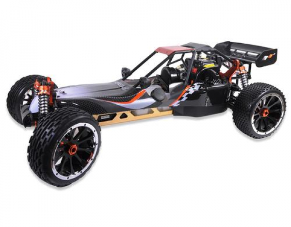 Der Buggy Pitbull X ist mit einem kraftvollen 32ccm 2-Takt Motor ausgestattet. Er fährt mit einem 2-Takt Benzingemisch von der Tankstelle. Das Chassis besteht aus CNC gefrästem, orange eloxiertem Aluminium. Technische Daten: Länge: 825 mm Breite: 480 mm Höhe: 270 mm Radstand: 610 mm Übersetzung: 1:9,6 Bodenfreiheit: 55 mm Gewicht: ca. 12,5 kg Raddurchmesser (v/h): 176/170 mm Radbreite (v/h): 65/75 mm Radmitnehmer: 22mm Motor: 32ccm 2-Takt Motor 700ccm Tank Lenkservo: 27 kg/cm Gasservo: 13 kg/cm Antrieb: 2WD CNC-gefräste Diff. Zahnräder doppelte Scheibenbremsanlage Bodenträgerplatte aus Aluminium Einzelradaufhängung mit Spur- und Sturzeinstellung Getriebezahnräder aus Metall 2,4 GHz Funkanlage GT-2 Lieferumfang: RC Buggy Pitbull X Profi Pistolenfernbedienung proportional 2,4 GHz Ladegerät Bedienungsanleitung Benötigtes Zubehör: 8x 1,5V Mignon AA Batterien für Fernsteuerung