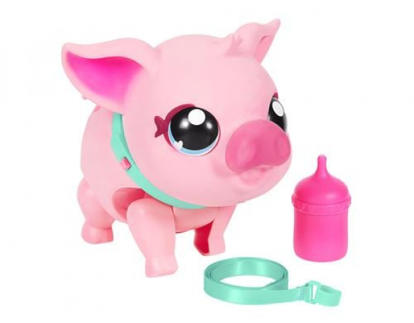 Die Welt der Little Live Pets freut sich über super-süßen Zuwachs: Piggly ist dein neues, niedlichen Schweinchen!,Mit mehr als 25 Geräuschen und Reaktionen klingt Piggly nicht nur wie ein echtes Ferkel, sondern bewegt sich auch so. Füttere sie mit ihrer Flasche und knuddle sie ? sie reagiert wirklich auf deine Berührungen! Wenn du sie in die Arme nimmst und deine Nase an ihrer Schnauze reibst, gibt sie dir einen Kuss. Piggly macht viele lustige und süße Geräusche: Sie grunzt, frisst, kichert, rülpst, schnüffelt, niest und pupst sogar ab und zu.,Piggly hat superweiche Haut und lustige Schlappohren, die bei jeder Bewegung wackeln. Du kannst mit ihr an der Leine spazieren gehen oder ihr zusehen, wie sie sich bewegt und zu ihrer Musik tanzt.,Piggly wird mit einer abnehmbaren Leine, einer Flasche und einer Gebrauchsanweisung geliefert. Batterien sind bereits im Lieferumfang enthalten, sodass ihr sofort zu spielen beginnen könnt!