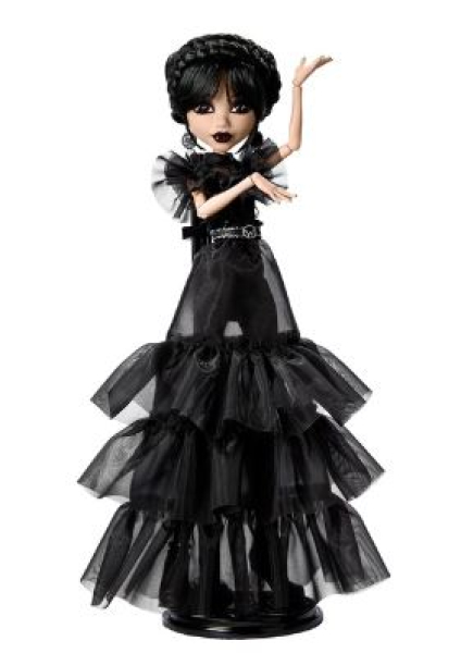 Die Puppen aus der Monster High x Wednesday-Kollektion sind eine Hommage an die weltweit bekannte Serie "Wednesday". Inspiriert von dem Vintage-Kleid ihrer Figur in der Schultanzszene der Fernsehserie macht diese Rave’N Wednesday Puppe in einem nachtschwarzen Kleid ganz auf Gothic-Glam. So düster wie ihr Sinn für Humor ist auch das Organza-Kleid von Rave’N Wednesday mit seinen durchsichtigen Lagen, die aussehen, als wären sie aus Schatten gesponnen. Ein Statement-Gürtel und Monster High-Ohrringe komplettieren ihren verrucht-schicken Look. Sie ist bereit, sich in ihren Schuhen in eine albtraumhafte Nacht zu stürzen! Ihre Eiszapfen- und Yeti-Absätze sind eine Hommage an das Thema des Rave'N-Tanzes: Klimakrise trifft Aussterbe-Event.