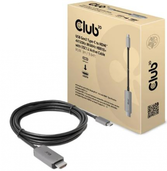 Das Club 3D CAC-1587 USB Gen2 Typ-C auf HDMI 4K120Hz 8K60Hz HDR10+ aktive DSC1.2-Kabel St./St. 3m ist die perfekte Lösung für den Anschluss an jedes HDMI 8K60Hz oder 4K120Hz-fähige Display. Falls Sie einen DisplayPort Alt Mode 1.4-fähigen PC mit einer USB Gen2 Typ-C-Verbindung oder ein anderes Gerät haben, dem die neue HDMI 8K60Hz- oder 4K120Hz-Spezifikation fehlt, ist das Club3D CAC-1587 die einfache Möglichkeit, Ihr Gerät zu aktualisieren und mit Ihrem neuen Fernseher zu verbinden. Mit seiner DP1.4 Alt Mode DSC-Videokomprimierungstechnologie ist dieses Kabel in der Lage, DP1.4 Alt Mode-Videosignale in HDMI umzuwandeln, Videoanzeigeauflösungen von bis zu 8K (7680 x 4320) bei 60 Hz zu unterstützen und lebensechte Farben und Bewegungen mit HDR10+ für das ultimative visuelle Erlebnis zu erzeugen. Das Kabel wird über den USB-Gen2-Typ-C-Anschluss mit Strom versorgt.