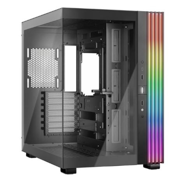 Light Base 600 DX Black ist für den großen Auftritt geschaffen. Nichts beweist das mehr als der massive ARGB LED-Streifen, der aus jedem Winkel sichtbar ist. Der 1,33m lange Streifen besteht aus 77 LEDs. Durch eine ARGB-Steuerung und der Möglichkeit die Beleuchtung mit dem Mainboard zu synchronisieren, kannst du Light Base 600 DX Black zu deinem ganz eigenen Gehäuse machen. Mit seinen abnehmbaren Füßen kannst du dieses Gehäuse wortwörtlich in Sekunden invertieren. Du kannst es auch horizontal positionieren, was genauso schnell geht. Light Base 600 DX Black kommt ohne vorinstallierte Lüfter. Du kannst aber bis zu 10 Lüfter installieren. Dank seines geräumigen Designs, kann das Gehäuse außerdem bis zu zwei 360mm Radiatoren, ein ATX-Mainboard und selbst stärkste Grafikkarten gleichzeitig aufnehmen. Durch sein 2-Kammer-Designs sind Laufwerke und Kabel geschickt an der Rückseite montiert und ermöglichen starken Airflow. Neben den Radiatoren im Deckel und Boden kannst du einen weiteren 240mm Radiator an der Seite und somit unglaubliche 3 Radiatoren gleichzeitig installieren. Light Base 600 DX Black hat 2 ARGB und PWM-Hubs mit insgesamt 12 Anschlüssen. Ihre Positionen oben und unten im Gehäuse ermöglichen dir einen einfachen Anschluss deiner Hardware. Light Base 600 DX Black kommt mit einem flexiblen Grafikkartenhalter der subtil deine Grafikkarte am Absinken hindert. Das Beste daran: Der Grafikkartenhalter funktioniert in alle Richtungen, sowohl mit horizontal als auch vertikal installierten GPUs.