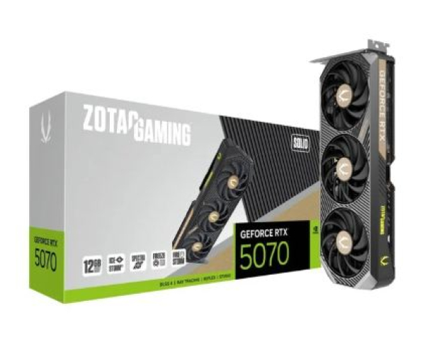 Die ZOTAC GeForce RTX 5070 Solid ist eine High-End-Grafikkarte mit der GeForce RTX 5070 GPU von NVIDIA. Die leistungsfähigen GeForce RTX 50-Grafikkartenserie basiert auf der NVIDIA Blackwell Architektur und bietet neue Stufen von Gaming Realismus, Geschwindigkeit und Leistungseffizienz, AI Features wie Frame Generation, Multi Frame Generation und realistische VR-Erlebnisse. Weitere Features sind Real-Time Ray Tracing, Ray-Reconstruction, NVIDIA Ansel, mit umfangreichen Werkzeugen zur Erstellung von Screenshots in Spielen sowie NVIDIA G-SYNC, G-SYNC HDR, NVIDIA DLSS 4, ShadowPlay, Highlights, NVENC Gen 9, AV1 Encoder und Decoder. Die GPU verfügt über 6144 CUDA Cores. Der 12 Gbyte große GDDR7-Speicher verfügt über einen 192-Bit-Speicherkontroller.