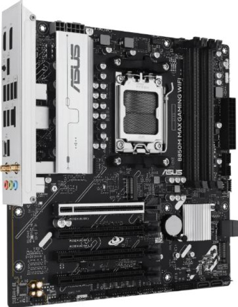 Das ASUS B850M MAX GAMING WIFI basiert auf dem AMD B850 Chipsatz und unterstützt AMD-Prozessoren für den Sockel AM5. Es verfügt über vier DDR5-Slots für bis zu 256 GB Arbeitsspeicher. Zur weiteren Ausstattung des ASUS B850M MAX GAMING WIFI gehören ein PCIe-5.0-x16-Slot und ein PCIe-4.0-x16-Slot (x1 Lanes). Außerdem verfügt das ASUS B850M MAX GAMING WIFI über 8-Kanal-Sound, eine Gigabit-LAN-Schnittstelle, Wi-Fi 6, Bluetooth 5.4, vier SATA3-Anschlüsse, drei M.2-Anschlüsse und eine Reihe an USB-Schnittstellen.