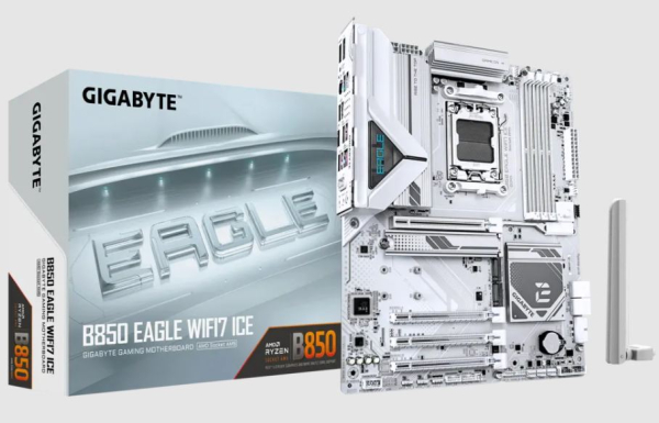 Das GIGABYTE B850 EAGLE WiFi7 ICE basiert auf dem AMD-B850-Chipsatz und unterstützt AMD-Prozessoren für den Sockel AM5. Es verfügt über vier DDR5-Slots für bis zu 256 GB Arbeitsspeicher. Zur weiteren Ausstattung des GIGABYTE B850 EAGLE WiFi7 ICE gehören ein PCIe-5.0-x16-Slot, ein PCIe-4.0-x1-Slot (x4 Lanes) und zwei PCIe-3.0-x16-Slots (x1 Lanes). Außerdem verfügt das GIGABYTE B850 EAGLE WiFi7 ICE über 8-Kanal-Sound, eine 2.5 Gigabit-LAN-Schnittstelle, vier SATA3-Anschlüsse, WiFi 7, Bluetooth, drei M.2-Anschlüsse und eine Reihe an USB Schnittstellen.