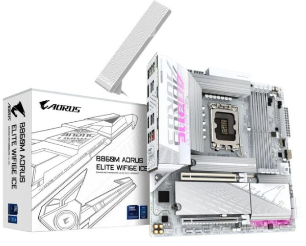 Das GIGABYTE B860M AORUS ELITE WIFI6E ICE basiert auf dem Intel®-B860-Chipsatz und unterstützt Intel®-Prozessoren für den Sockel 1851. Es verfügt über vier DDR5-Slots für bis zu 128 GB Arbeitsspeicher. Zur weiteren Ausstattung des GIGABYTE B860M AORUS ELITE WIFI6E ICE gehören ein PCIe-5.0-x16-Slot und ein PCIe-4.0-x16-Slots (x4 Lanes). Außerdem verfügt das GIGABYTE B860M AORUS ELITE WIFI6E ICE über 8-Kanal-Sound, eine 2.5 Gigabit-LAN-Schnittstelle, WiFi 6E, Bluetooth 5.3, vier SATA3-Anschlüsse, drei M.2-Anschlüsse und eine Reihe an USB Schnittstellen.