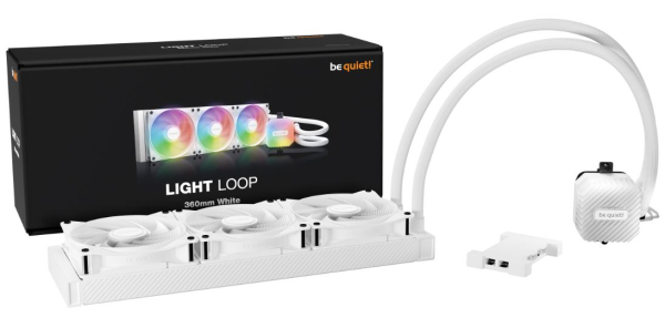 Die Light Loop 340mm aus dem Hause be quiet! ist eine leistungsfähige All-in-One-Wasserkühlung mit beleuchtetem ARGB-Kühlblock aus Aluminium. Mit ihren drei Light Wings LX PWM High Speed-Lüftern, die jeweils 16 integrierte LEDs haben, liefert sie auch in übertakteten Systemen genug Kühlleistung. Dazu tragen auch die Pumpe mit fortschrittlichem, Schaltgeräusche reduzierendem IC und die speziell entwickelten Jet Plate und Cold Plate bei. Die Jet Plate aus Metall erhöht den Druck der Kühlflüssigkeit und sorgt damit für eine verbesserte Leistung. Die Cold Plate mit einer hohen Lamellendichte erhöht die Kühlleistung auf modernen High-End-CPUs. Der mitgelieferte ARGB-PWM-Hub ermöglicht die Synchronisation von bis zu sechs ARGB-Komponenten und PWM-Lüftern. Über den leicht zugänglichen Refill-Port fällt die Wartung dieser Wasserkühlung leicht - eine Flasche Kühlflüssigkeit ist ebenfalls im Lieferumfang enthalten.