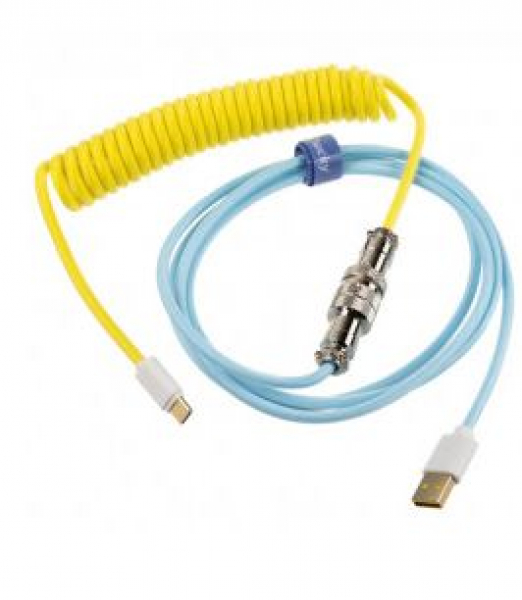 Mit dem Premicord bietet Ducky eine schicke Möglichkeit, seine mechanische Gaming-Tastatur zu inszenieren. Das selbststraffende Spiralkabel ist etwa 1,8 m lang und mit einer flexiblen Nylon-Ummantelung versehen. Diese sieht nicht nur gut aus, sie schützt auch vor Kabelbrüchen und gleitet leicht über den Schreibtisch. Die Ummantelung der hier angebotenen Farbvariante Cotton Candy ist in zarten Pastelltönen gehalten, wobei die Hälfte mit dem Spiralkabel gelb und die andere Hälfte in einem sehr zarten Hellblau gehalten ist. Die Anschlüsse sind in Weiss gehalten.