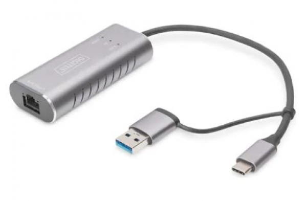 Mit dem USB Netzwerkadapter DN-3028 von Digitus kann man einen Laptop mit USB Type-C Schnittstelle um einen RJ 45 Gigabit Ethernet Netzwerkanschluss erweitern. Dank der USB-C 3.2 Schnittstelle kann im Gegensatz zu USB 2.0 die volle Geschwindigkeit von bis zu 2.500 Mbit/s erreicht werden. Dank der einfachen Plug & Play Konfiguration müssen keine Treiber installiert werden. Die Stromversorgung erfolgt bequem über die USB-C Schnittstelle. Der mitgelieferte USB-A Adapter ermöglicht außerdem die Nutzung mit älteren USB-Buchsen, abwärtskompatibel zu USB 3.0 und niedriger.