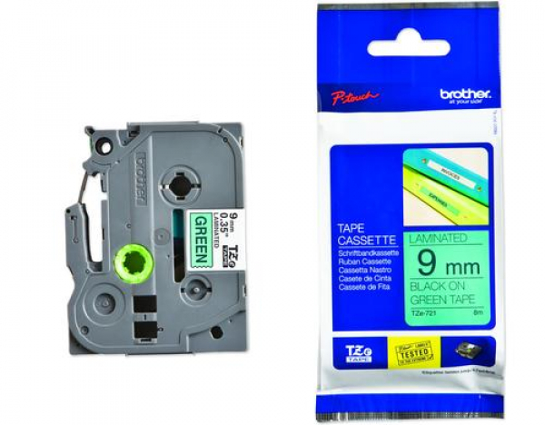 Brother Schriftband TZe-721 9 mm, Schwarz auf Grün