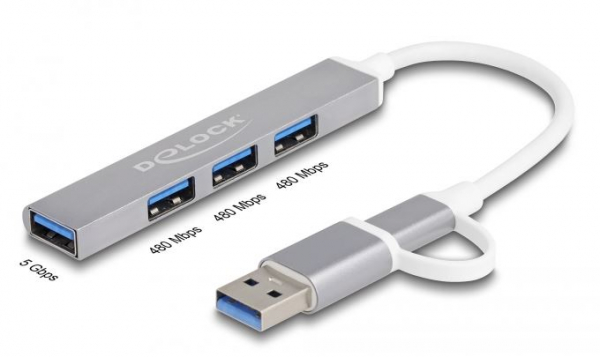 DeLock 64214 - 4 Port Slim USB Hub mit USB Type-C oder USB Typ-A zu 3 x USB 2.0 Typ-A Buchse + 1 x USB 5 Gbps Typ-A Buchse
