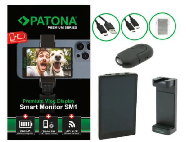 PATONA Premium Smart Monitor SM1 - das smarte Zubehör für mobile Foto- und Videoaufnahmen. Der SM1 fungiert als externer Selfie-Monitor für die Hauptkamera deines Smartphones und ermöglicht gestochen scharfe Aufnahmen mit optimalem Bildausschnitt. Perfekt für Content Creator, Vlogger, Fotografen und alle, die mehr aus ihrer Smartphone-Kamera herausholen möchten. Main Features: - Automatische Ausrichtung: Unterstützt Hoch- und Querformat- Aufnahmen. - Ausdauernder Akku: 920mAh Batterie für bis zu 2 Stunden bei maximaler Helligkeit. - Schnellladefunktion: USB-C Anschluss, Ladezeit ca. 2,5 Stunden. - Kompakt & leicht: Nur 105g perfekt für den mobilen Einsatz. - Brillantes Display: 3,97 Zoll Bildschirm mit 480 × 800 Pixeln und 300cd/m² Helligkeit. - WiFi-Verbindung: 2,4GHz für kabellose Echtzeit-Übertragung. - Magnetische Befestigung: Einfach anbringen und abnehmen. - Spiegelmodus: Anzeige kann gespiegelt werden, um die Ausrichtung korrekt darzustellen. Lieferumfang: 1x PATONA Premium Smart Monitor SM1, 1x Fernbedienung,1x Monitorhalterung,1x Kabel USB-C auf USB-C,1x Kabel USB-A auf USB-C 1x QR-Code zur digitalen Anleitung