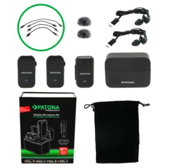 Das PATONA Premium Wireless Mikrofon-Set wurde speziell für die Verwendung mit Smartphones und DSLR-Kameras entwickelt. Es ermöglicht eine bessere Audioqualität bei Videoaufnahmen, da es das eingebaute Mikrofon des Smartphones bzw. der DSLR-Kamera übertrifft. Unser Set besteht aus zwei drahtlosen Sendern (TX) und einem Empfänger (RX), die in der Lage sind, das Audiosignal zwischen dem Mikrofon und dem Aufnahmegerät zu übertragen. Der interne Aufnahmemodus der Sender (TX) untersützt Speicherkarten bis 32GB. Ansteckmikrofone -auch Lavalier-Mikrofone genannt- sind aufgrund ihrer kleinen Bauweise ideal für Interviews, Bühnenauftritten, Reden, Filmproduktionen und Präsentationen geeignet. Um den Empfänger (RX) mit dem Aufnahmegerät zu verbinden, stehen folgende Kabel zur Verfügung: USB-C auf Apple Connector Lightning, USB-C auf 3,5mm Klinke, USB-C auf USB-C Lieferumfang: - Ladecase, 1 Emfpänger (RX), 2 Sender (TX), 2x Windschutz, 2 kabelgebundene Headsets mit USB-C-Anschluss, 1 USB-A auf USB-C Kabel (zur Aufladung), 1 USB-C auf Apple Connector Lightning Kabel, 1 USB-C auf 3,5mm Klinke Kabel, 1 USB-C auf USB-C Kabel