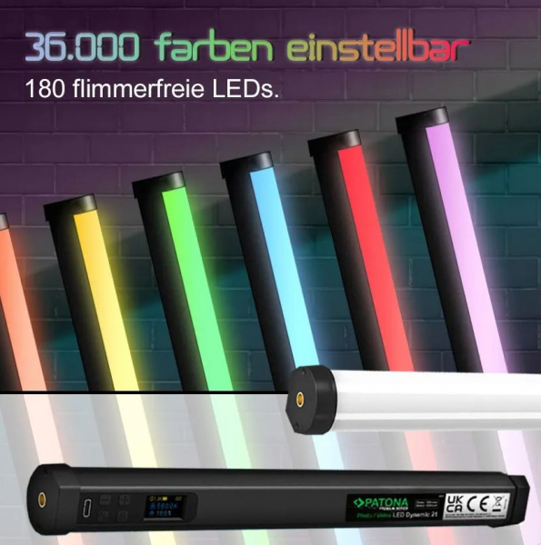 Neu im Premium-Sortiment ist unser PATONA 10W LED Dynamic 10W Handheld Licht mit 180 hochwertig flimmerfreien LEDs. Bei diesem PATONA Premium Produkt handelt es sich um ein neu entwickeltes LED RGB Licht, welches 21 voreingestellte Effekte und Simulationen bietet und damit im Bereich der Fotografie und Videoproduktion zum Einsatz kommt. Ein integriertes OLED-Display zeigt den aktuellen Status an. Technische Daten 21 voreingestellte Effekte, Simulation verschiedener Szenen, wie z.B. Blitz, TV-Simulation, Kerzenschein, Flammen, Polizei, Ambulanz, Feuerwehr, Stroboskoplichter, Feuerwerk etc. Anzahl LED: 180 Stück (72 Stück kaltweiß, 72 Stück warmweiß, 36 Stück RGB) Modi: CCT: Farbtemperatur und Helligkeit / HSI: Farbauswahl und Sättigung / EFFECT: Szenensimulation Farbtemperaturbereich: 2500K bis 9900K (CCT) bis zu 36.000 Farben- und Sättigungseinstellung (HSI) RGB-Farbton (HSI): 0-360° Einstellung der Farbsättigung: 1-100 Einstellung der Helligkeit: 1-100% Lichtstrom, Lumen: 1200lm (0,5m 5600lm) CRI (Farbwiedergabeindex): 95 oder höher weiches und gleichmäßiges Licht zwei 1/4-Zollgewinde für Zubehörschuhe (Cold-Shoe-Adapter) kompakte Bauweise: nur 32,4cm Maximale Leistung: 10W integriertes OLED-Display Path-Through-Charging wird unterstützt Akku: 5200mAh, Li-Ion Eingang: USB-C, 5V/2A Gehäusematerial: Aluminiumlegierung Größe: 324 x 37 x 38mm Gewicht: ca. 320gr