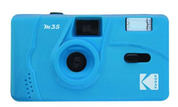 Die Kodak M35 Filmkamera mit Blitz in blau ist eine kleine wiederverwendbare Filmkamera, die mit 35-mm-Film arbeitet. Die Kamera verfügt über ein 31-mm-Objektiv mit festem Fokus, manuelle Filmauf- und -abwicklung und einen eingebauten Blitz mit Ein/Aus-Schalter. Ausserdem wird sie bequem mit einer AAA-Alkalibatterie betrieben. Legen Sie eine Rolle 35-mm-Film in die Kamera ein und machen Sie Fotos, dann wickeln Sie den Film ab und lassen ihn entwickeln.
