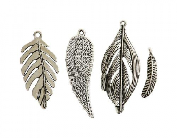 Creativ Company Anhänger Federn, 29-25 mm, Silber, 4 Stück / Lochgrösse 12-20 mm, Antiksilber, 4 sort. / Thema: Anhänger