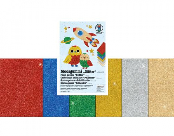 URSUS Moosgummi-Set Glitter Klassik selbstklebend, 10 Stück / selbstklebend, 20 x 30 cm, 10 Blatt, 6 Far. / Thema: Moosgummi