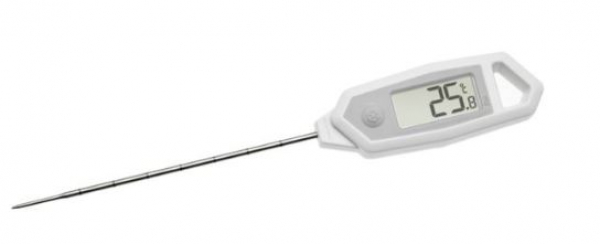 Das handliche digitale Einstich-Thermometer 30.1064 von TFA Dostmann überzeugt durch seine schnelle Ansprechzeit und die hohe Genauigkeit ab ± 0,5°C. Einfach aus der mitgelieferten Schutzhülle herausnehmen, den Edelstahl-Einstichfühler in das Messobjekt stecken und den ON-Knopf betätigen, innerhalb von 4 bis 5 Sekunden erscheint der gemessene Wert im Bereich von -40 bis +250°C. Zum besseren Ablesen der Temperatur kann eine Hintergrundbeleuchtung eingeschaltet werden. Je nachdem, wie das Thermometer gehalten wird, lässt sich das Display per Knopfdruck um 180° drehen und so von Links- und Rechtshändern optimal ablesen. Die gemessenen Höchst- und Tiefstwerte werden gespeichert und sind abrufbar. Das Thermometer schaltet sich automatisch nach 10 Minuten aus. Für Langzeitmessungen kann die Abschaltautomatik deaktiviert werden. Ein Werkszertifikat mit drei Messpunkten (0°C / 100°C / 150°C) ist standardmäßig im Lieferumfang enthalten. So eignet sich das Gerät auch ideal für den Profi-Einsatz, z.B. zur Temperaturkontrolle von Lebensmitteln im Rahmen der HACCP-Verordnungen oder im Labor. Die benötigte Knopfzell-Batterie ist im Lieferumfang enthalten.