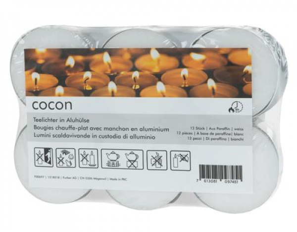 COCON Teelichter gross in Aluhülse 12 Stück, Weiss / 12 Stk. Weiss, Brenndauer 8 Stunden, / Thema: Wachskerzen