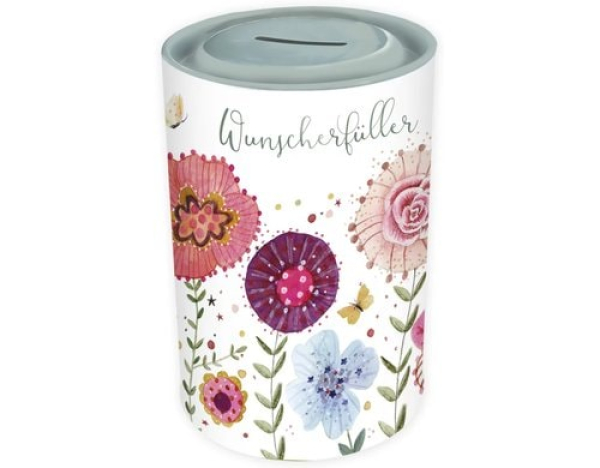 Grätz Spardose Flower Power Blume / Metall, 12.5x8.5 cm (HxD), Deckel aufmachen / Thema: Spardosen