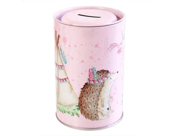 Grätz Spardose Kleine Abendteurerin Hase/Igel / Metall, 12.5x8.5 cm (HxD), Deckel aufmachen / Thema: Spardosen