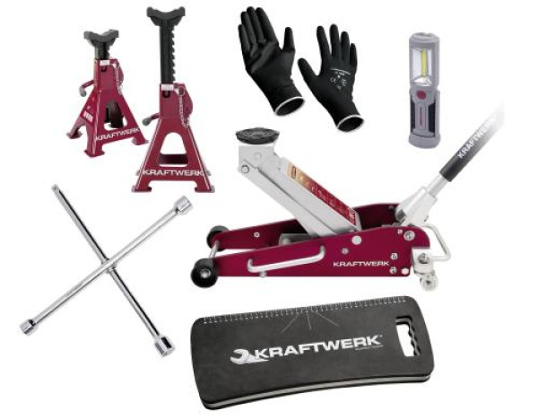 Kraftwerk Radwechsel-Set mit Doppelkolben-Pumpsystem 2,5 Tonnen / m. Doppelkolben-Pumpsystem / Thema: Reifenwechselwerkzeug