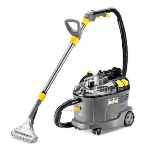 Dank seiner hervorragenden Rücksaugleistung ermöglicht der professionelle Waschsauger Puzzi 8/1 Adv von Kärcher sehr gute und hygienische Reinigungsergebnisse sowie eine schnelle Wiederbegehbarkeit von textilen Flächen. Dazu sprüht das Sprühextraktionsgerät die Reinigungslösung tief in die Textilfasern ein, saugt diese anschliessend inklusive des gelösten Schmutzes wieder ab und eignet sich so perfekt zur Reinigung von Polstern, Teppichböden und anderen textilen Oberflächen. Seine robuste, kompakte Bauweise sorgt für eine lange Lebensdauer und damit eine hohe Wirtschaftlichkeit ideal für Gebäudereiniger, im Hotel- und Gaststättengewerbe oder bei der Fahrzeuginnenreinigung. Zur besseren Sicht auf die Schmutzflotte sind der Gerätedeckel sowie die Polster- und die Bodendüse transparent gehalten. Ein Sichtfenster am Griff erhöht die Kontrollmöglichkeiten weiter wirkungsvoll. Das geringe Gewicht des Puzzi 8/1 Adv und ein ergonomischer Tragegriff ermöglichen einen einhändigen Transport. Grosse, per Hand oder Fuss bedienbare Drucktasten erhöhen dazu den Anwenderkomfort.