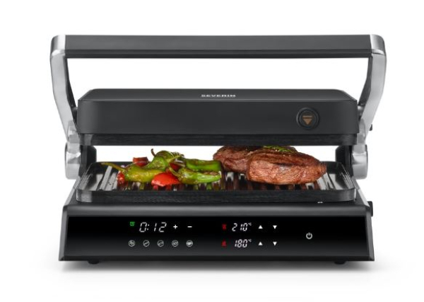 Der Kontaktgrill SEVINI Comfort KG 2399 von Severin bietet vielseitige Grillvarianten mit fünf verschiedenen Automatikprogrammen (Hühnchen, Würstchen, Steak, Fisch, Gemüse) und einem manuellen Grillprogramm, für jeden Geschmack etwas. Der Kontaktgrill SEVINI Comfort kann dank aufklappbarer Grillfläche auch als Tischgrill genutzt werden. So passt gleich doppelt so viel Grillgut auf die Fläche. Die spezielle Antihaft-Keramikbeschichtung der Grillplatten sorgt für besondere Kratzfestigkeit und gewährleistet, dass der Grill auch bei intensiver Nutzung lange Freude macht. Die Funktionstasten und ein praktischer An-/Ausschalter sorgen für eine einfache Bedienung, und der SEVINI Comfort verfügt über eine Fettauffangschale an der Rückseite, die die Reinigung erleichtert. Die Grillplatten können zur Reinigung ebenfalls entnommen werden.