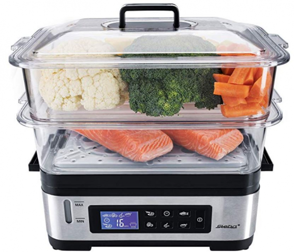Der Dampfgarer DG 2 von Steba bietet zwei stapelbare Gareinsätze, einen seperaten Reiseinsatz sowie einen 30-Min.-Timer mit mit Signalton und Endabschaltung. Mit einer Leistung von 1200 Watt und der schnellen Dampferzeugung, lassen sich Speisen im DG 2 zügig dampfgaren. Die BPA-freien Gareinsätze sind mit herausnehmbaren Böden ausgestattet, so kann der Garraum von 3 auf 6 Liter erweitert werden. Für eine komfortable Bedienung sorgen das LCD-Display mit 5 Automatikprogrammen, der externe Wasserzulauf und die Warmhaltefunktion.