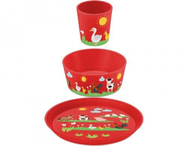 Koziol Kindergeschirrset Connect Farm 3-teilig / Teller+Schale+Becher, rot, bio-circular / Thema: Kindergeschirr