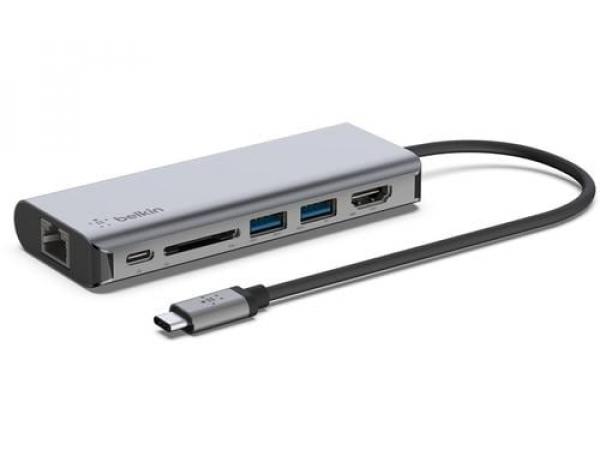 Mit dem USB-C-6-in-1-Multiport-Adapter von Belkin verbinden Sie mehrere Geräte mühelos mit Ihrem Laptop. Mit dieser Komplettlösung können Sie den USB-C-Anschluss Ihres Computers so erweitern, dass Sie Zugang zu folgenden Anschlüssen haben, über die viele neuere Laptops nicht mehr verfügen: HDMI, 2x USB-A, Ethernet, SD-Kartenleser und USB-C PD. Der Adapter kann sowohl als Port-Erweiterung als auch zur Stromversorgung mit 100 W per "Passthrough" über das angeschlossene Gerät verwendet werden. Da der USB-C-6-in-1-Multiport-Adapter schlank und kompakt ist, lässt er sich leicht transportieren, eignet sich perfekt für User mit mehreren Workstations und sorgt für Ordnung auf dem Schreibtisch. Unterstützt 4K-Auflösungen und eine Bandbreite von bis zu 5 Gbit/s zum Datentransfer zwischen einem Laptop und Peripheriegeräten.