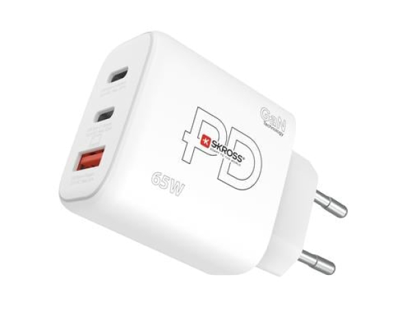 Power Charger EU 65W GaN Dieser ultrakleine, leistungsstarke Power Charger USB-C 65 W GaN PD EU von SKROSS® sorgt bequem für einen vollen Akku und lädt Ihren Laptop oder Ihr USB-Gerät (2x USB C, 1 x USB A) mit einer Leistung von 65 W. Kompatibel in mehr als 160 Ländern mit dem Euro-Steckdosenstandard. Mit Power Delivery (PD) ist es problemlos möglich einen Laptop, ein Smartphone, ein Tablet, ein Audiogerät und mehr ultraschnell mit Strom zu versorgen. Ultraklein und mit der neuesten GaN-Technologie ausgestattet. - Geeignet in allen Ländern mit EU-Steckdosenstandard - 65 W GaN PD Wandladegerät (2 x USB Typ-C, 1 x USB Typ-A) - Eingang: 100 V - 240 V~, 50/60 Hz, 1,5 A