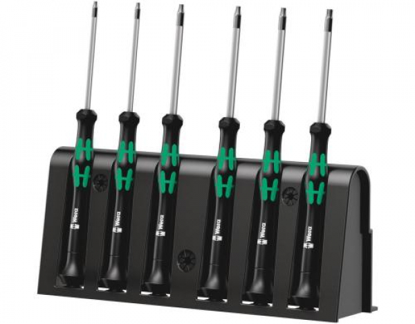 Der Wera 2067/6 Elektroniker TORX BO Schraubendrehersatz Kraftform Micro + Rack mit Black Point Spitze besteht aus sechs TORX-Schraubendrehern. Die Wera Black Point Spitze sowie das aufwändige Härteverfahren bieten Langlebigkeit, Passgenauigkeit und optimierten Korrosionsschutz. Der mehrkomponentige Schraubendrehergriff ermöglicht ergonomisch richtiges Arbeiten. Dank der drehbaren Kappe und der Schnelldrehzone unterhalb dieser Kappe ist blitzschnelles Zwirbeln möglich. Zeitintensives Umgreifen wie bei herkömmlichen Feinschraubendrehern entfällt ersatzlos. Die Präzisionszone direkt über der Klinge gibt dem Anwender ein gutes Gefühl für den richtigen Drehwinkel bei Justierarbeiten. Die Griff-Kennzeichnung "Take it easy" mit Farbcodierung nach Profilen sorgt außerdem für leichteres Auffinden in der Werkzeugtasche und am Arbeitsplatz. Der Schraubendreher-Satz wird mit Rack geliefert, das am Arbeitsplatz aufgestellt werden kann. So ist eine ordentliche Aufbewahrung und schneller Zugriff gewährleistet.