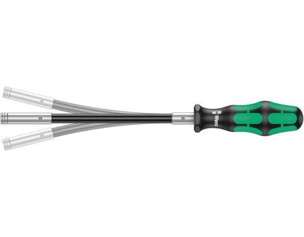 Der Bits-Handhalter 393 S Bits-Handhalter extra slim, mit flexiblem Schaft von Wera eignet sich für Bits mit 1/4"-Außensechskantantrieb nach DIN ISO 1173-C, 6,3 und Wera Anschluss-Reihe 1. Die 1/4"-Innensechskantaufnahme mit Verriegelungsmechanismus ist zusätzlich magnetisch und sorgt für sicheren Halt der Bits. Mit dem von Wera entwickelten mehrkomponentigen Kraftform-Griff findet die ganze Hand Kontakt zum Griff. Die glatten, harten Zonen gleiten beim Umgreifen wie Räder durch die Hand und ermöglichen besonders hohe Arbeitsgeschwindigkeiten. Die griffigen, weichen Zonen sind optimale Anlageflächen für die Hand und ermöglichen hohe Kraftübertragung. Der Abrollschutz verhindert unkontrolliertes Wegrollen des Bits-Handhalters.