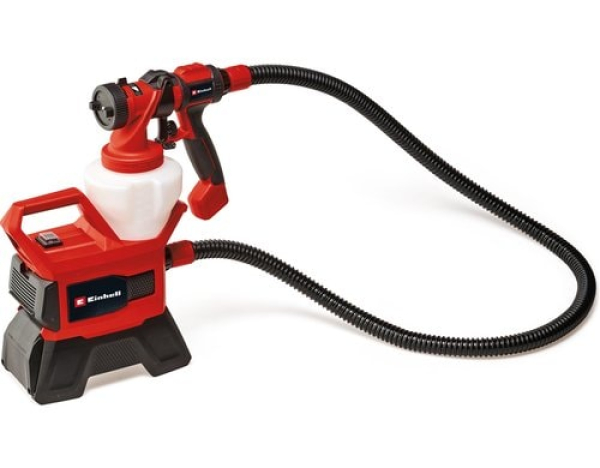 Das EINHELL Akku-Farbsprühsystem TE-SY 18/90 Li- eignet sich zum Sprühen von lösemittelhaltigen und wasserverdünnbaren Lackfarben, Lasuren, Grundierungen, Klarlacken, Kraftfahrzeug-Decklacken, Beizen und Holzschutzmitteln, Wasch- und Imprägniermitteln und Ölen. Das halbstationäre System ist für mittelgroße bis große Arbeitsflächen gedacht und ist dank der separaten Gebläsestation, des Schultergurts und des 1,8 Meter langen Luftschlauchs angenehm in der Handhabung. Bis zu 1.000ml pro Minute fördert der Motor, und durch die verstellbare Luftkappe kann man Vertikal-, Horizontal- oder Rundstrahl auswählen. Mit der Farbmengenregulierung lässt sich der Farbauftrag an nahezu jeden Untergrund anpassen. Die Luftmenge kann auch individuell eingestellt werden, wodurch die Breite des Farbstrahls bestimmt werden kann. Der Sprühkopf ist zur leichten Reinigung aller farbführenden Elemente abnehmbar. Drei Düsen für unterschiedliche Lack- und Lasurviskositäten, ein 100ml-Behälter zur Viskositätsprüfung, eine Reinigungsbürste zum Reinigen des Steigrohrs und Reinigungsnadel zum Säubern der Sprühdüse und ein 1.200ml-Farbbehälter mit Messskala und passendem Deckel werden mitgeliefert. Die klappbare, durchsichtige Abdeckung schützt den Akku vor dem Kontakt mit Flüssigkeiten, Schmutz und Farbspritzern. Die Lieferung erfolgt ohne Akku und ohne Ladegerät. Zum Betrieb des Akku-Farbsprühsystem TE-SY 18/90 Li-Solo ist ein separat erhältlicher 18 Volt-Systemakku aus der Power X-Change-Reihe erforderlich, wie er auch in den anderen Einhell Werkzeugen und Gartengeräten benutzt wird.