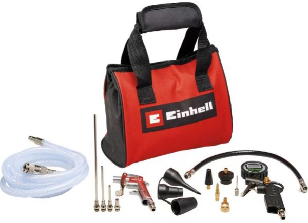 Das Original Einhell 15-teilige Druckluftset mit Tasche beinhaltet passendes Zubehör für jeden Kompressor. Das Set enthält einen digitalen Reifenfüllmesser, eine Ausblaspistole mit 4 Düsen, 8 gängige Ventiladapter, einen 2.5 m langen Gewebeschlauch und eine Aufbewahrungstasche. Der Reifenfüllmesser hilft beim Befüllen von Reifen und ist mit einem digitalen Manometer ausgestattet. Mit dem Set aus 8 gängigen Adaptern ist man bestens für diverse Ventile gerüstet, wie z. B. für Ballventile, Dunlop-Ventile oder Schraubventile. Zur Aufbewahrung findet das gesamte Druckluftset Platz in der mitgelieferten Aufbewahrungstasche.