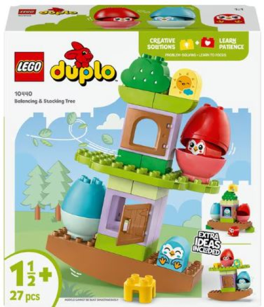Der Baum zum Balancieren und Stapeln aus der Serie LEGO DUPLO ist ein Lernspielzeug für Kleinkinder. Das wackelige Modell bietet jede Menge Spielspaß mit den Babyeulen und dem putzigen Baumhaus. Dieses Vorschulspielset vermittelt Kleinkindern die Fähigkeit, Probleme zu lösen und Geduld zu entwickeln, wenn sie herausfinden, wie sie die Elemente stapeln und platzieren müssen, damit der Baum das Gleichgewicht hält. Tierliebe Kleinkinder können den Baum auch mit zusätzlichen Steinen stabilisieren oder einfach das Baumhaus mit den Eulen erkunden. Mit Hilfe des Tag-und-Nacht-Spielsteins können Erwachsene Kleinkindern zeigen, dass diese nachtaktiven Vögel tagsüber in ihren Eiern schlafen und dann in der Nacht spielen. Wenn Kleinkinder die Eier öffnen, üben sie ihre Fingerfertigkeit. Und um die Eulen in die passenden Schalen zu stecken, müssen sie die Farben erkennen und richtig zuordnen. Dieses Set lässt sich vielseitig umgestalten, um Kleinkinder kreativ spielen zu lassen.