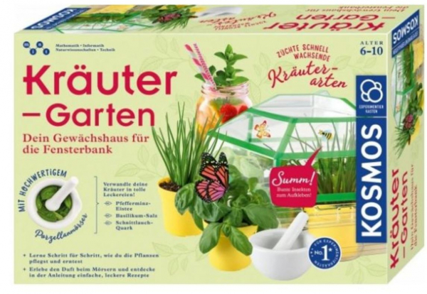 Kleine Gärtnerherzen schlagen höher! Ein eigenes Gewächshaus für die Fensterbank, das mit bunten Stickern verschönert wird, ist der perfekte Start in die Welt der Kräuter. Nur noch ein wenig Erde in die beiliegenden Pflanztöpfchen geben und schon kann die Aussaat beginnen. Die Samen von Pfefferminze, Zitronenbasilikum und Schnittlauch werden auf die Pflanzentöpfchen verteilt und dann heißt es Abwarten und den Kräutern beim Wachsen zusehen! Mit dem schnellwachsenden Pflanzen erblüht der Kräutergarten schon in kurzer Zeit. Die altersgerechte Anleitung des Sets führt durch die einzelnen Bereiche – von Pflanzenkunde, über die richtige Pflege bis zur Ernte. Außerdem warten tolle, kinderleichte Rezepte für Pfefferminz-Eistee, Basilikum-Salz und Schnittlauch-Quark auf die kleinen Gärtner. Das Highlight dieses Experimentiersets von KOSMOS: Mit dem hochwertigen Porzellan-Mörser zerkleinern die Kinder ihre geernteten Kräuter. Mmh, wie köstlich es auf der Fensterbank und in der Küche duftet!