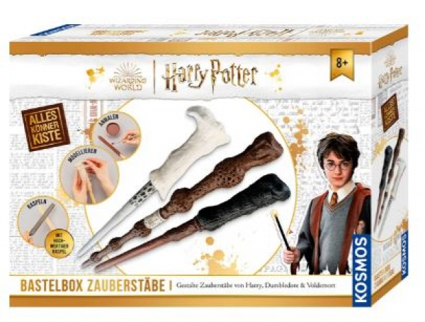 Mit diesem tollen Bastelset können Kinder ab 8 Jahren selbst Zauberstäbe herstellen - ganz wie wie Ollivander, der berühmte Zauberstab-Macher in der Winkelgasse. Enthalten sind die Zauberstäbe von Harry Potter, Dumbledore und Voldemort aus Holz und Modelliermasse. Dabei lernen Kinder den Umgang mit einer Holzraspel. Mit Schleifpapier, Modelliermasse, Modellierwerkzeug sowie Farbe wird das Holz weiterverarbeitet und in einen Zauberstab verwandelt. Die farbige Anleitung führt detailliert durch alle Schritte und liefert viele Tipps und Tricks. So entstehen Nachbildungen der mächtigsten Zauberstäbe aus der Wizarding World. Diese Bastelset ist ein tolles Geschenk voller Magie - nicht nur für Fans von Harry Potter.