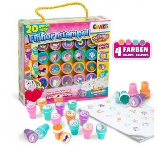 Mit dem Set STAMPS Unicorn von CRAZE lernen Kinder spielerisch Einhörner kennen. Das Set beinhaltet 20 Stempel mit Einhorn-Motiven in 4 verschieden Farben und einen Block zum Stempeln. Die Stempelfarbe ist abwaschbar. Alles ist im praktischen Koffer verpackt
