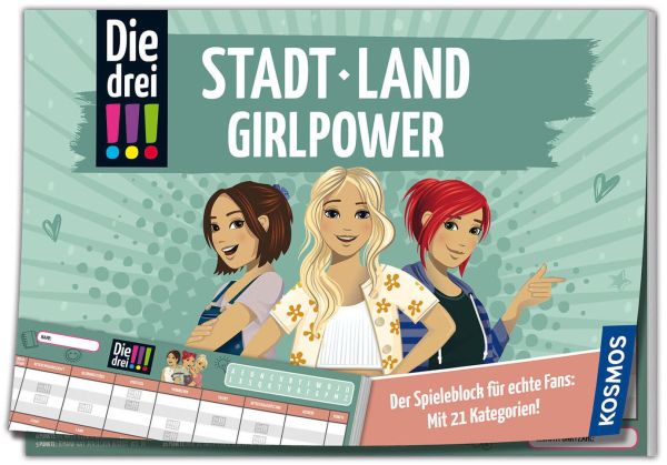 Kim, Franzi und Marie fordern euch heraus in "Die drei !!!: Stadt - Land - Girlpower" von KOSMOS. Das weltbekannte Spielprinzip von “Stadt - Land - Fluss” mit einem neuen Twist: 21 neue, spannende Kategorien warten auf euch! Zeigt, was in euch steckt, wenn es um Detektivinneneigenschaften, Tatorte und Superstars geht. Sammelt Punkte mit eurem Fanwissen und gewinnt mit doppelter Intelligenz. Für Fans der drei !!! ist dieser Spieleblock nicht nur ein Ratespaß, sondern auch ein Must-Have, das in keiner Sammlung fehlen darf.