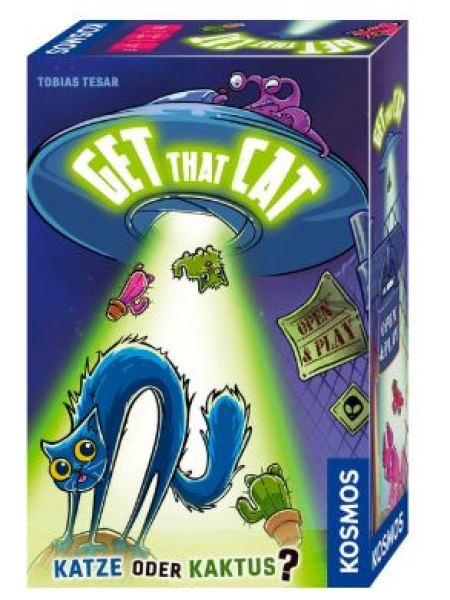 Achtung, Katze oder Kaktus? Auf Kommando werden gleichzeitig die Karten aufgedeckt. Jetzt genau hinschauen! Wo stecken die Katzen? Schnell die passende Ufo-Scheibe zum richtigen Zeitpunkt in die Box werfen, um die Katzen mit dem Lichtstrahl einzusammeln. Doch aufgepasst: Unter die Katzen haben sich ganz unauffällig Kakteen gemischt, die keine Punkte geben und natürlich auch nicht ins Ufo gehören. Wer schafft es, die meisten Katzen einzusammeln? "Get the cat" ist ein lustiges Reaktionsspiel, in dem Schnelligkeit, Konzentration und Geschick gefragt sind.