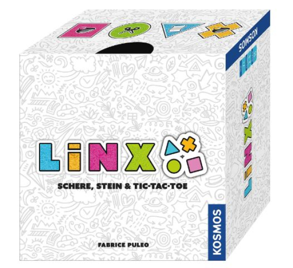 Die Spieleklassiker „Tic-Tac-Toe“ und „Schere, Stein, Papier“ in Einem – das ist "Linx"! Die Spielerinnen und Spieler versuchen drei gleiche Plättchen in einer Reihe zu platzieren. Dafür entscheiden sie, ob sie ein neues Plättchen offen orthogonal oder diagonal angrenzend an ein vorhandenes anlegen oder dieses verdeckt einsetzen, um ein anderes Plättchen zu überdecken. Der Clou: Plättchen dürfen nur verdeckt gespielt werden, wenn das Symbol das darunter liegende Teil nach den „Schere, Stein, Papier“-Regeln übertrifft. Ein raffiniertes Taktikspiel mit einfachen Regeln für zwei bis vier Spielerinnen und Spieler ab sieben Jahren - im kompakten Format zum Mitnehmen oder Verschenken.