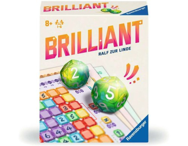 Brilliant ist ein Roll & Write Spiel mit einem ganz besonderen Clou: Von zwei gewürfelten Zahlen muss eine der beiden neben die andere (bereits eingetragene Zahl) eingetragen werden. Auf diese Weise füllt sich das Blockblatt und die jeweiligen farbigen Edelsteingebiete. Dabei müssen aber bestimmte Vorgaben eingehalten werden. Manchmal dürfen es nur (un)gerade Zahlen sein, manchmal zwei verschiedene Zahlen. Es gibt auch Edelsteingebiete in denen immer nur die gleiche Zahl eingetragen werden darf. Da sich das Blockblatt immer weiter füllt, wird das Ausfüllen der Edelsteingebiete Runde um Runde immer kniffliger. Wer am Ende am die meisten und wertvollsten Edelsteingebiete gesammelt hat, gewinnt dieses spannende Spiel für bis zu sechs Personen.