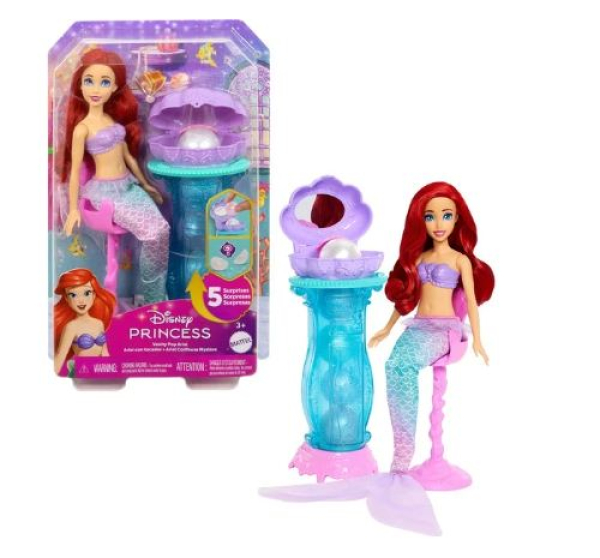 Die Meerjungfrau-Magie nimmt kein Ende mit der Disney Prinzessin Meerjungfrauen-Überraschung von Mattel! Inspiriert von Disneys Film "Arielle, die Meerjungfrau" macht sich die Arielle-Modepuppe am Schminktisch für ihr Abenteuer bereit. Dabei warten tolle Überraschungen. Oben auf dem Schminktisch erscheint eine Perle mit einem Überraschungs-Accessoire. Beim Entfernen der Perle kommt der Schatz darin zum Vorschein und eine neue Perle erscheint an ihrer Stelle. Die Muschel lässt sich neu auffüllen, damit diese Arielle-Puppe mit Schminktisch, Spiegel und Accessoires immer wieder neue Abenteuer an Land und unter Wasser erleben kann.
