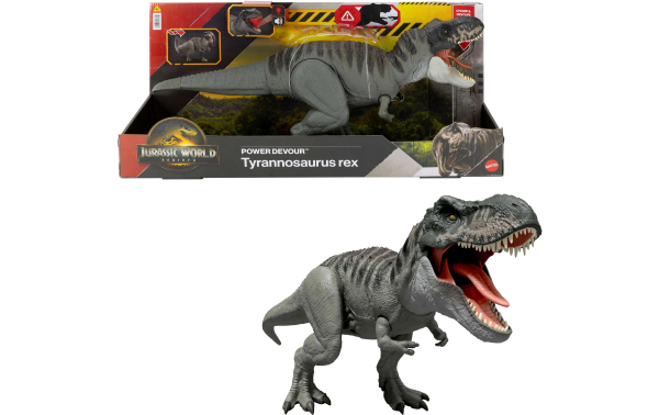 Dieser Power Devour Tyrannosaurus Rex von Mattel wurde vom Film "Jurassic World" Die Wiedergeburt" inspiriert und verfügt über eine furchterregende Beiß-Attacke! Wird seine Zunge heruntergedrückt, gibt er zuerst ein lautes Brüllen von sich. Wird sie nicht losgelassen und weiterhin gedrückt, aktiviert sich seine kraftvolle Beiß-Attacke mit begleitenden Lichtern und Geräuschen. Lass den T-Rex in epischen Schlachten gegen andere Dinos antreten: Über den Schwanz kann sein Kopf nach oben und unten oder nach rechts oder links bewegt werden - dabei ist sein Maul weit geöffnet. Durch Scannen des Tracking-Codes auf dem Fuß des Dinosauriers in der kostenlosen Jurassic World Play App mit einem kompatiblen Smart-Gerät (Android oder iOS, nicht enthalten) werden eine digitale Version des Dinosauriers sowie ein lustiges Spiel freigeschaltet.