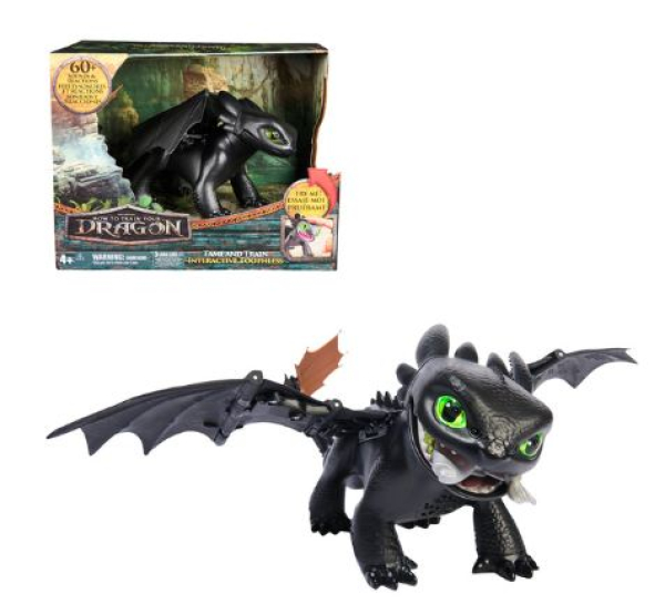 Die Drachen sind wieder los und wollen gezähmt werden - im DreamWorks-Film "Drachenzähmen leicht gemacht". Star des Films: der witzige und mutige Drache Ohnezahn. Mit dieser interaktiven Actionfigur von Spin Master kommen die Drachenabenteuer nach Hause. Die Drachenfigur ist im Look des Films gestaltet und besitzt Licht- und Soundeffekte sowie tolle Funktionen zum Spielen. Der Drache kann wie im Film trainiert und als Freund gewonnen werden. Durch Bewegungssensoren am Kopf reagiert Ohnezahn auf Handbewegungen und dreht seinen Kopf in die entsprechende Richtung. Bevor er sich allerdings streicheln lässt, muss er erst besänftigt werden. Er kann seinen Mund öffnen und lässt sich füttern. Seine Stimmung kann man an seiner Augenfarbe erkennen - rot, grün oder blau? Natürlich kann der süße Drache auch seine Flügel bewegen. Er wird in einer Verpackung geliefert, die an die Schlüsselszene in der Lagune aus dem Film angelehnt ist.